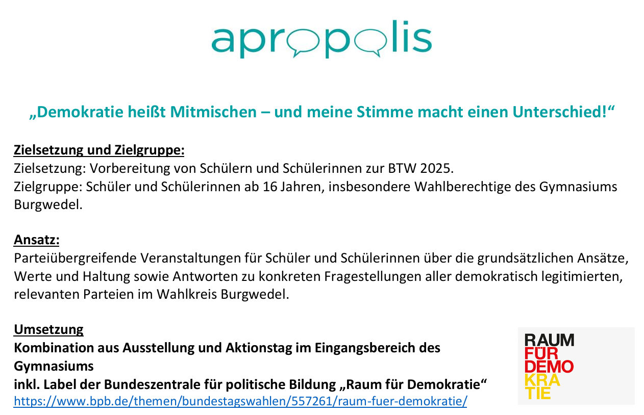 Burgwedel ist bunt und der mit dem Preis der Margot Friedländer Stiftung ausgezeichnete Verein apropolis aus Burgwedel veranstalten mit den Schülern des Gymnasium Großburgwedel eine Infoaktion unter dem Namen